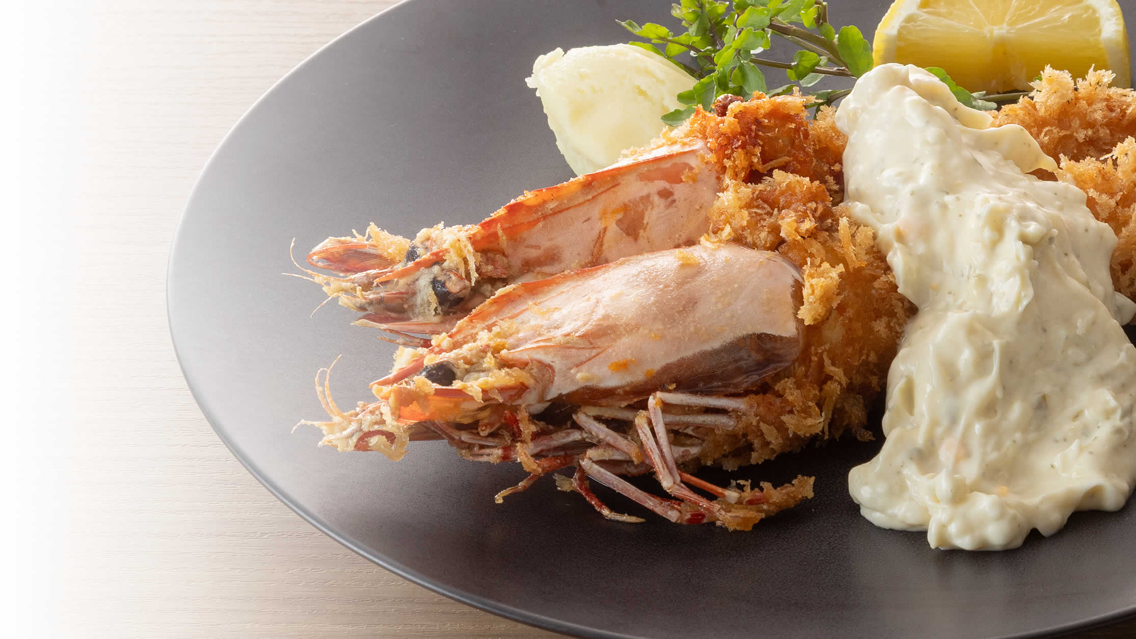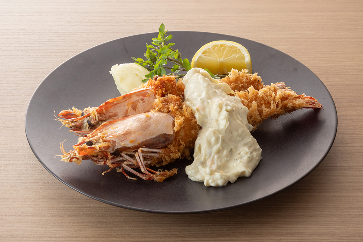 迫力満点のイリアンタイガーを使用した特大エビフライ。極上のエビ味噌とタルタルソースとの組み合わせをご堪能ください。