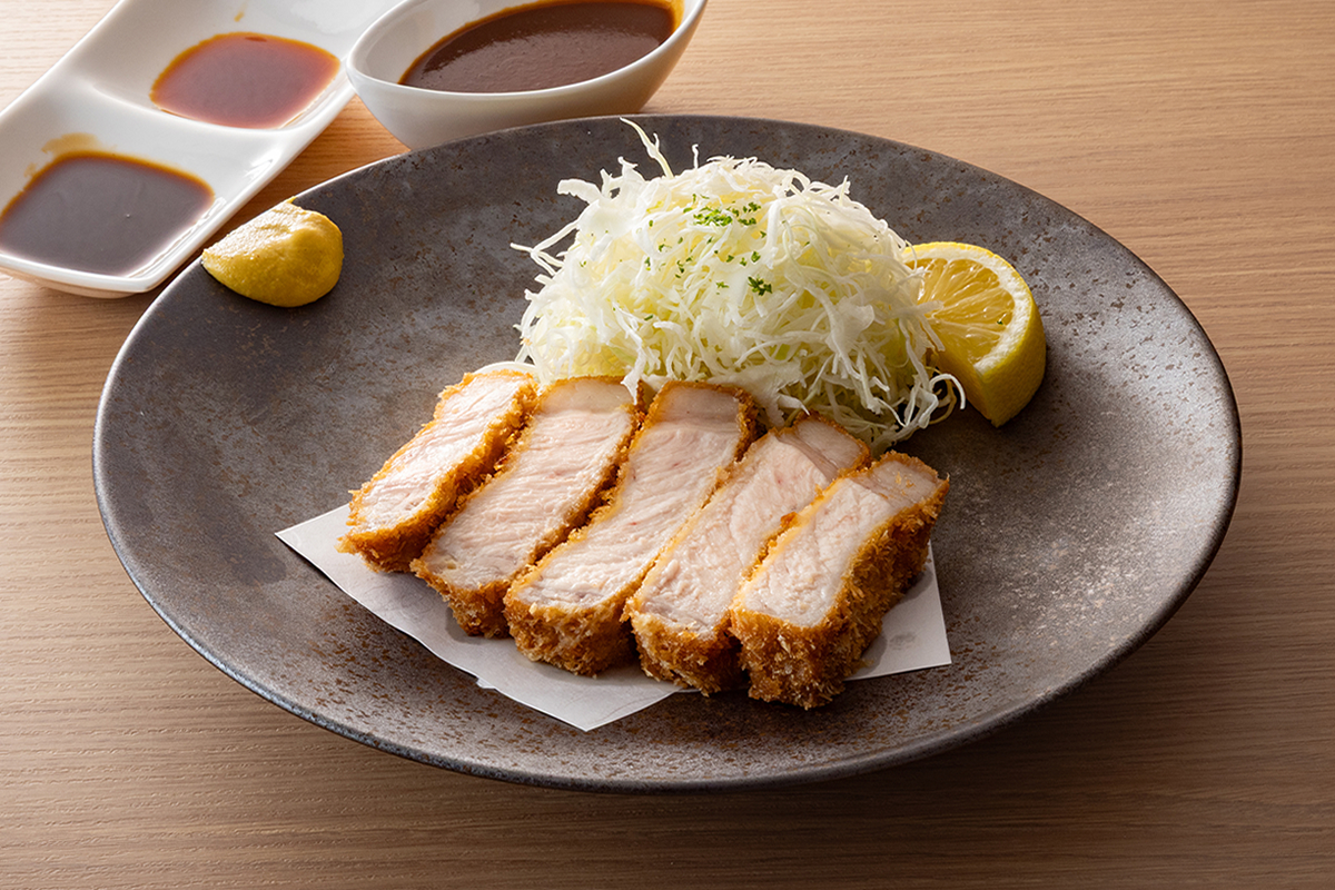 茶美豚を贅沢に厚切りし絶妙な火入れで仕上げました。こだわりの3種の味わいと共にお楽しみ下さい。(デミグラスソース、オリジナルとんかつソース、醤油)